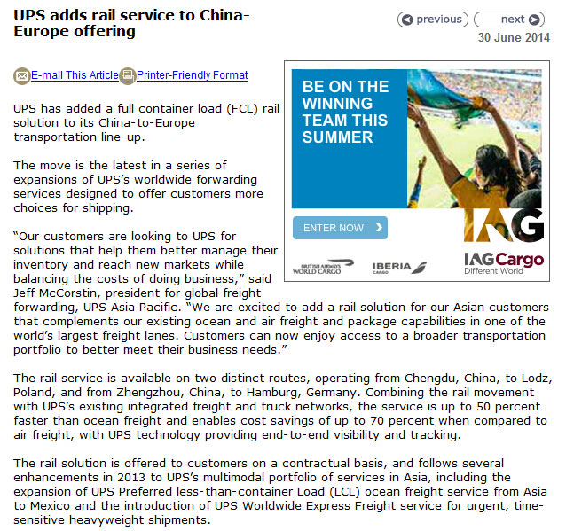 ![]() 提高歐洲與中國(guó)彈性地板物流高效及低成本的新渠道--ups新增中國(guó)至歐洲鐵路運(yùn)輸服務(wù) ups在中國(guó)至歐洲的運(yùn)輸路線中新增了集裝箱鐵路運(yùn)輸服務(wù)方案,這項(xiàng)方案也是ups國(guó)際運(yùn)輸最新系列計(jì)劃中的一項(xiàng),此方案將逐步為客戶 提供更多的線路選擇。 清查.拓展新市場(chǎng),以保持業(yè)務(wù)發(fā)展與開銷的平衡。所以我們積極地為ups亞洲的客戶們建立起了一套鐵路交通方案以補(bǔ)充現(xiàn)有的航運(yùn)和空運(yùn)線路, 成為全世界最大的運(yùn)輸通道之一!客戶現(xiàn)在可以享受到更寬泛的運(yùn)輸服務(wù)。 網(wǎng)絡(luò),速度比傳統(tǒng)海運(yùn)提高了50%,成本比空運(yùn)減少了70%。同時(shí)ups的貨物追蹤定位技術(shù)從頭到尾為客戶提供了安全和信譽(yù)的保障。 快遞服務(wù)以及時(shí)效性強(qiáng)和重量級(jí)的運(yùn)輸服務(wù)。