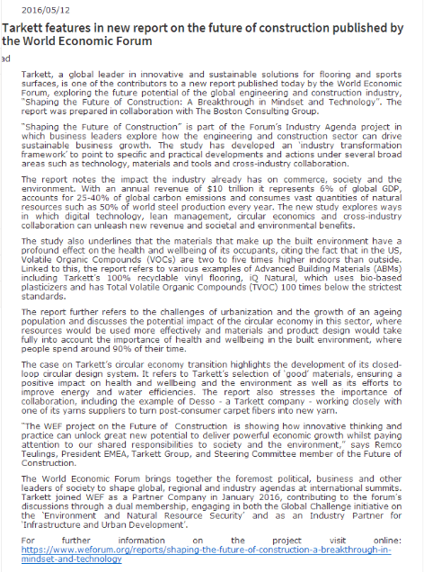 得嘉, 是創(chuàng)新和可持續(xù)發(fā)展解決方案的全球地板和運(yùn)動(dòng)表面領(lǐng)導(dǎo)者,2016年世界經(jīng)濟(jì)論壇與波士頓咨詢(xún)集團(tuán)(Boston Consulting Group)合作貢獻(xiàn)一份報(bào)告:探索未來(lái)全球工程和建筑行業(yè)的潛力,“塑造未來(lái)的建筑:心態(tài)和技術(shù)突破。
