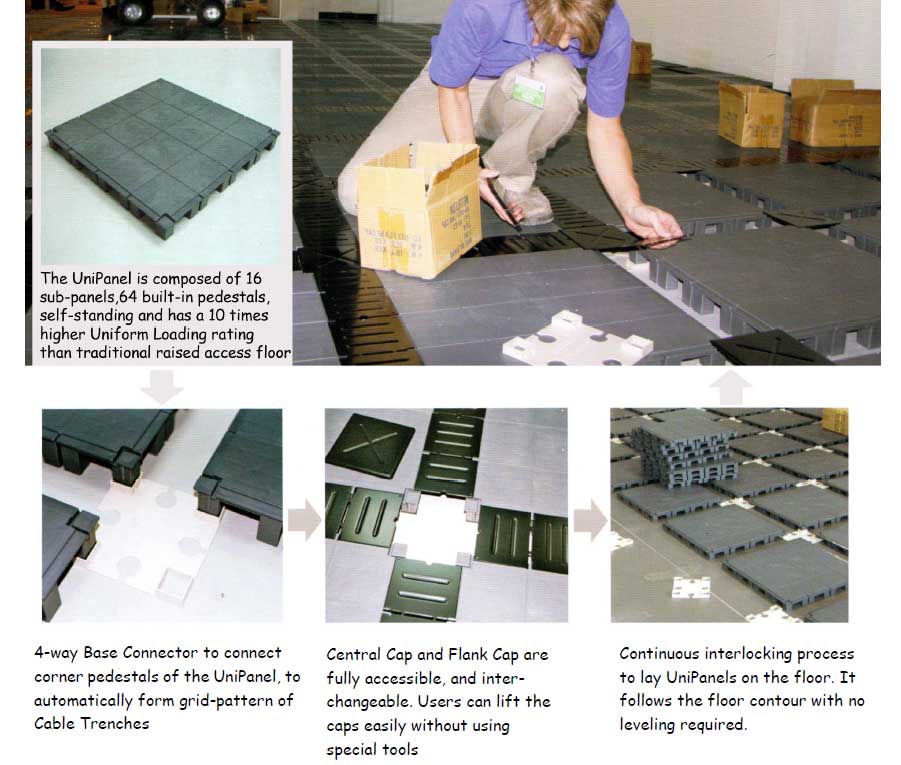 有別于一般傳統(tǒng)高架地板系統(tǒng)需將腳座以粘膠劑粘于地面固定,本系列產(chǎn)品之設(shè)計、施工不需使用粘膠劑。而是使用連接底座 連接腳架 |